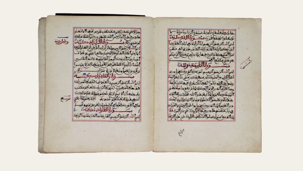 Verso and recto pages from a Quran manuscript open at Sūra 98. Sūrat al-Qayyima/al-Bayyina.