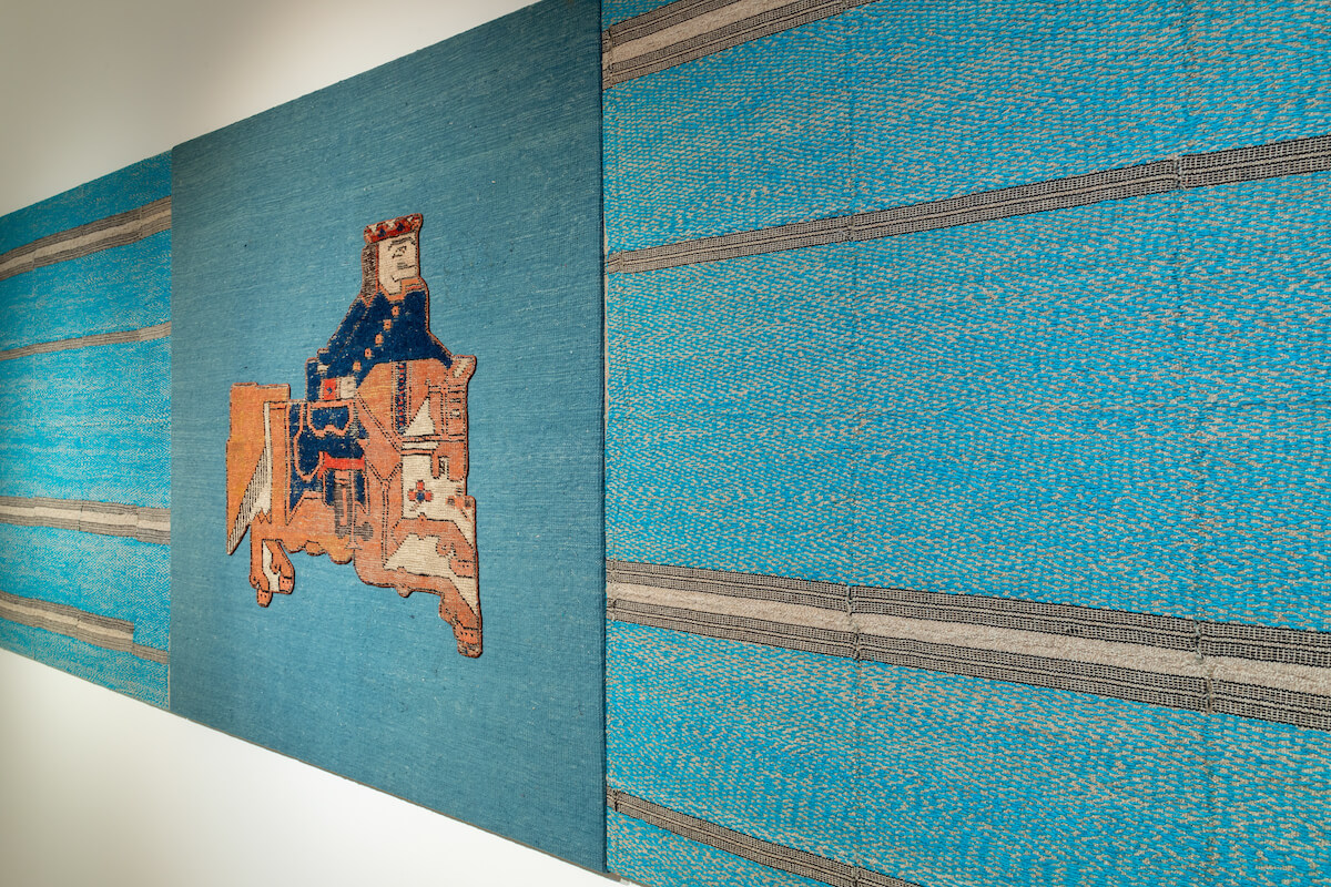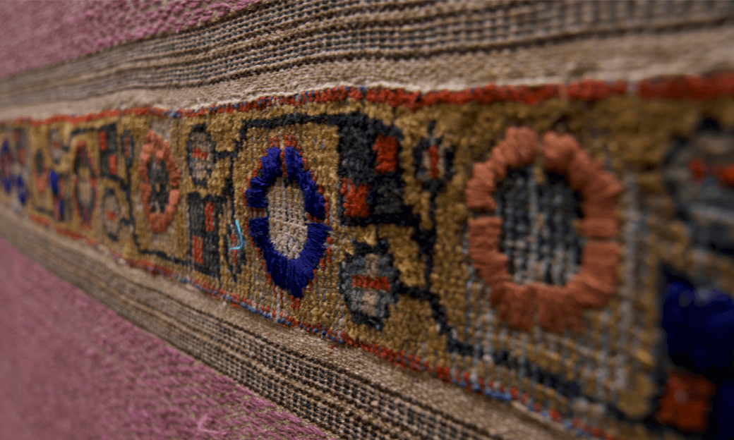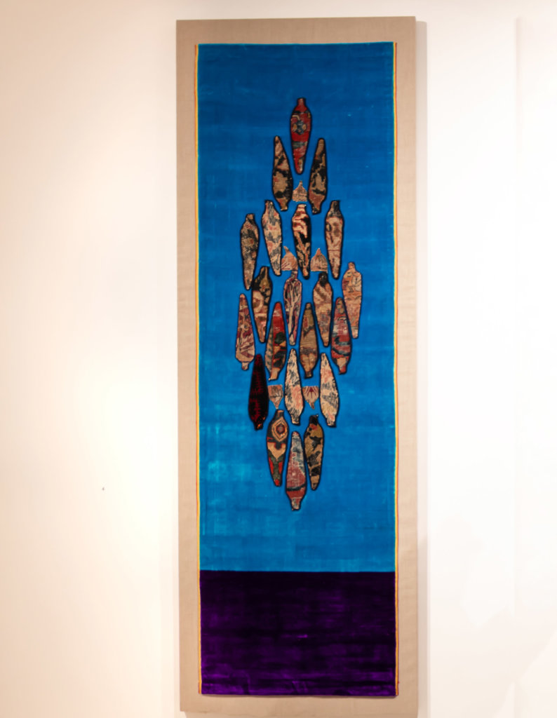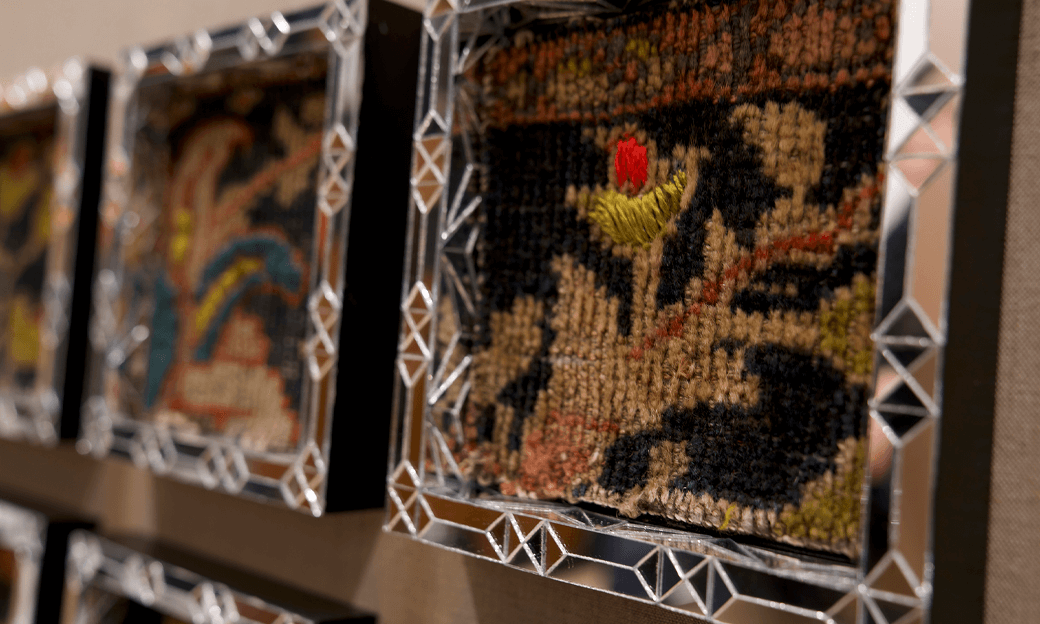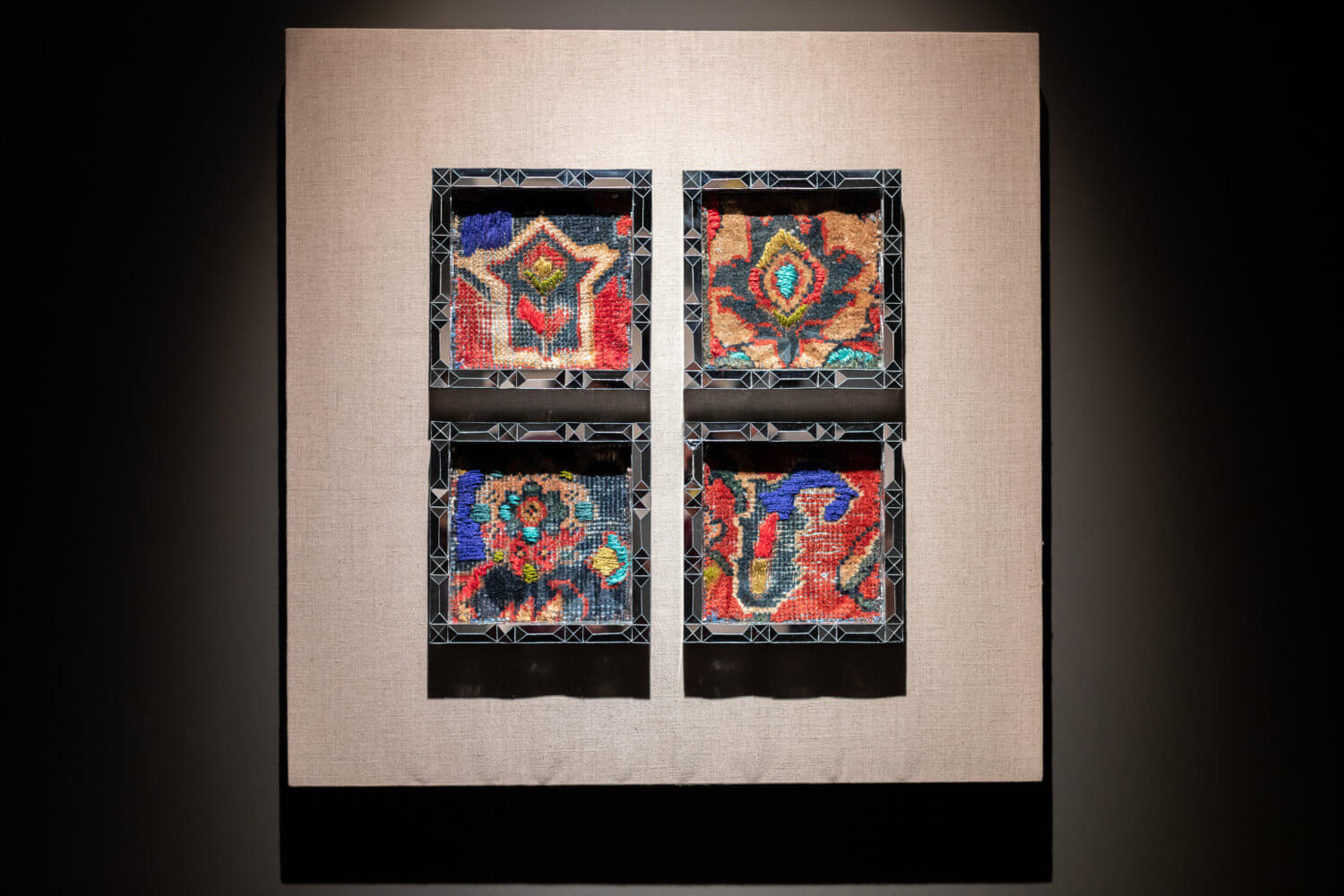Aga Khan Centre Gallery presents an exhibition by internationally renowned textile artist Bita Ghezelayagh. This exhibition gives us a glimpse into her practice which is influenced by her Iranian cultural heritage. Bita Ghezelayagh transforms old woven textiles and eastern carpets into new pictorial objects and works of art. She uses traditional embroidery techniques along with found materials to transform disused textiles, giving them a renewed sense of life and an altogether, different purpose. This exhibition includes a series of new works created recently that have not been shown before. Carpet squares rethreaded in part with coloured wool are adorned with shimmering mirror borders to give a jewel like aesthetic. While her new Offcut series reveal deconstructed forms that resemble templates for body armour that may have once been used. This exhibition connects us to Bita’s cultural history of textile traditions in Iran as well as her fascination and love for beautiful old materials and techniques.